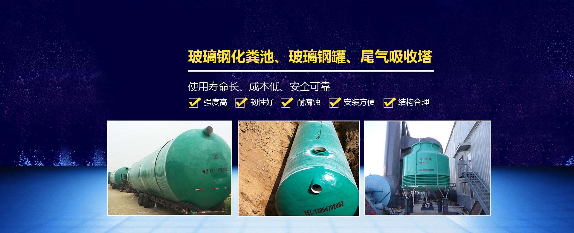 本公司主要生產的產品有:玻璃鋼生物化糞池、污水處理一體化、地埋式消防水池、隔油池、尾氣吸收塔等100多種產品,產品覆蓋20多個省市自治區。